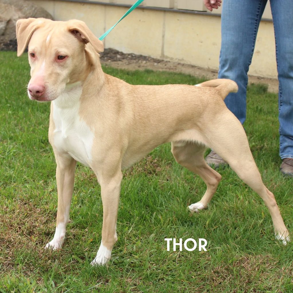 Thor is a 4 year old male Lab / Terrier mix that was born here to his mama Lorraine! Thor was an adorable pup who lived a happy life with his family until the little girl in the family was found to be allergic to dogs. Though he is adjusting to shelter life we are sure he dreams every night of getting back into a real home with people that love him and a soft bed to sleep on. If you can give him t